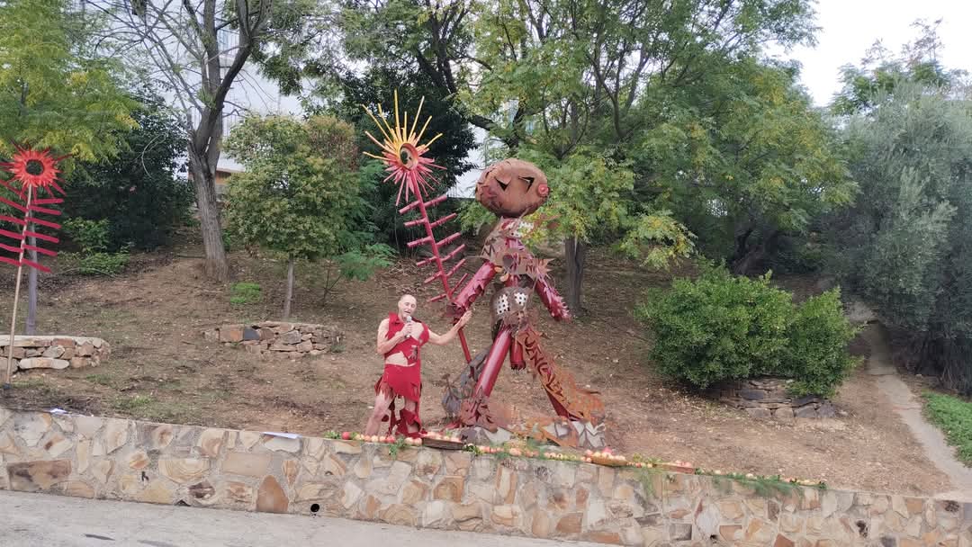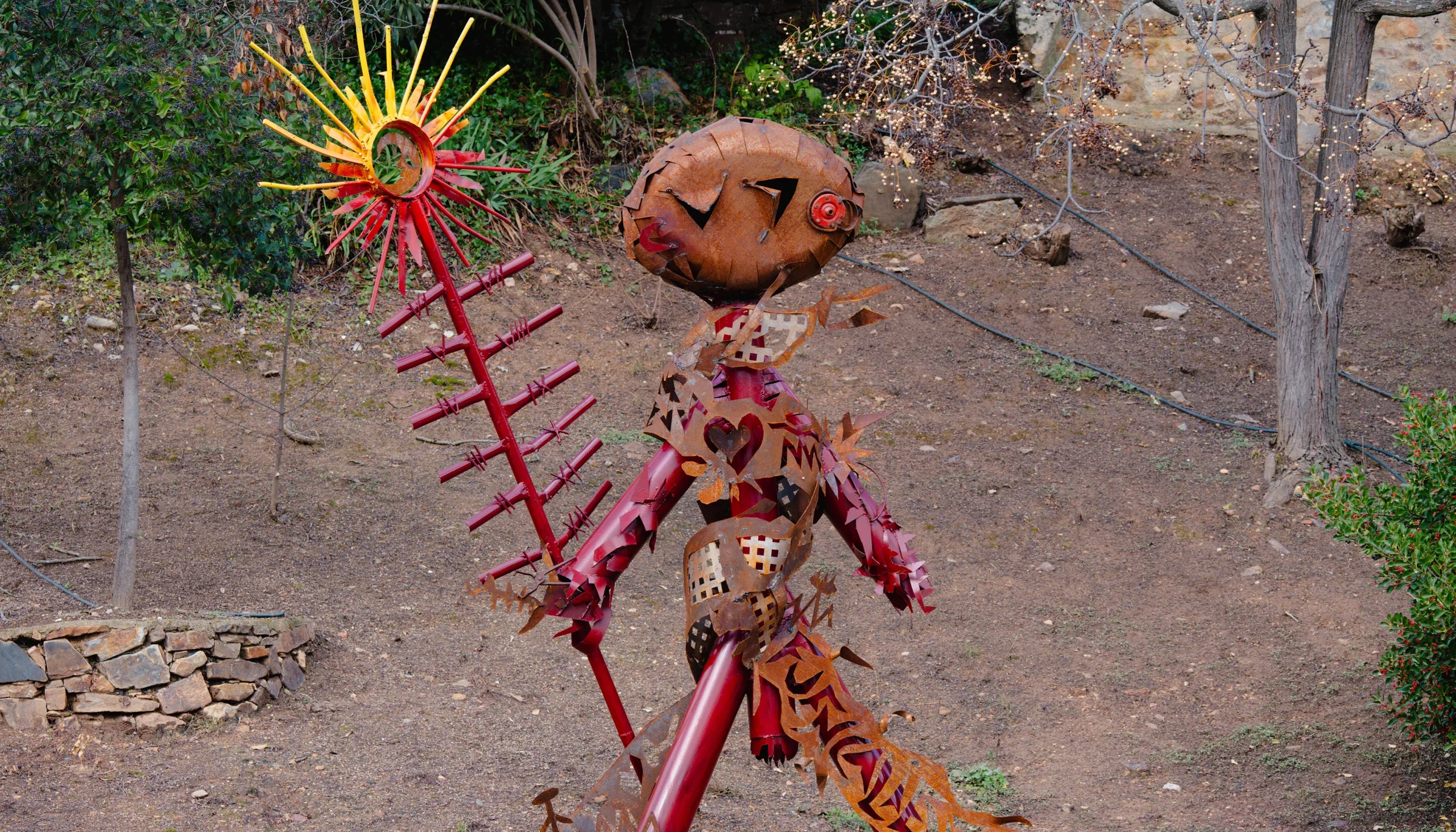 Realizada en hierro forjado con un acabado en color cobre, su diseño se inspira en las figuras femeninas del panel de Las Parideras de Peña Escrita. Con el tiempo, adquirirá una pátina que evocará los tonos originales de estas pinturas prehistóricas.